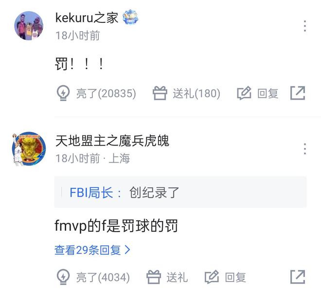 常规赛前2场比赛,亚历山大一共获得40次罚球,这直接创造了新的NBA纪录,让他超越张伯伦成为了NBA历史上前2场获得罚球最多的球员,没有之一(之前张伯伦是38次)。对于亚历山大的爆“罚”力,网友也是纷纷进行调侃,其中一名网友评论道:罚。单单一个字,直接言简意赅,被20000多球迷点赞,还有网友表示,原来FMVP的F是罚球的意思(罚球的英文是free throw),这样的评论也是受到了4000多点赞。